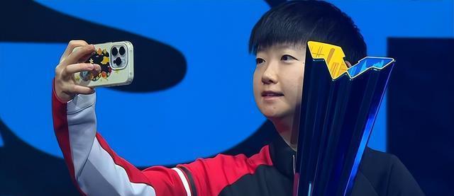 最后是冠军自拍环节。莎莎一手托着奖杯,一手拿着手机,一脸呆萌地自拍。这一刻孙颖莎是台上最幸福的人。
