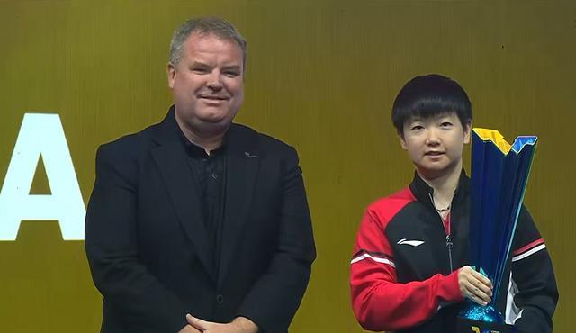 夺得冠军的孙颖莎跟着登台领奖。国际乒联集团首席执行官,兼任世界乒乓球职业大联盟(WTT)首席执行官的史蒂夫.丹顿给孙颖莎颁奖。孙颖莎真是有排面。孙颖莎微笑着举着冠军奖杯,与史蒂夫.丹顿一起合影。